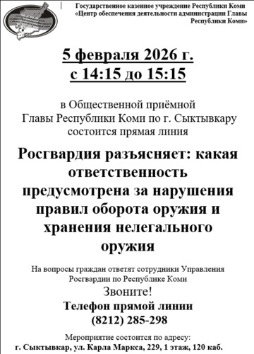 5 февраля 2026 года с 14:15 до 15:15 в Общественной приёмной Главы Республики Коми в Сыктывкаре сотрудники Росгвардии ответят на вопросы граждан о правилах оборота оружия и ответственности за хранение нелегального оружия.