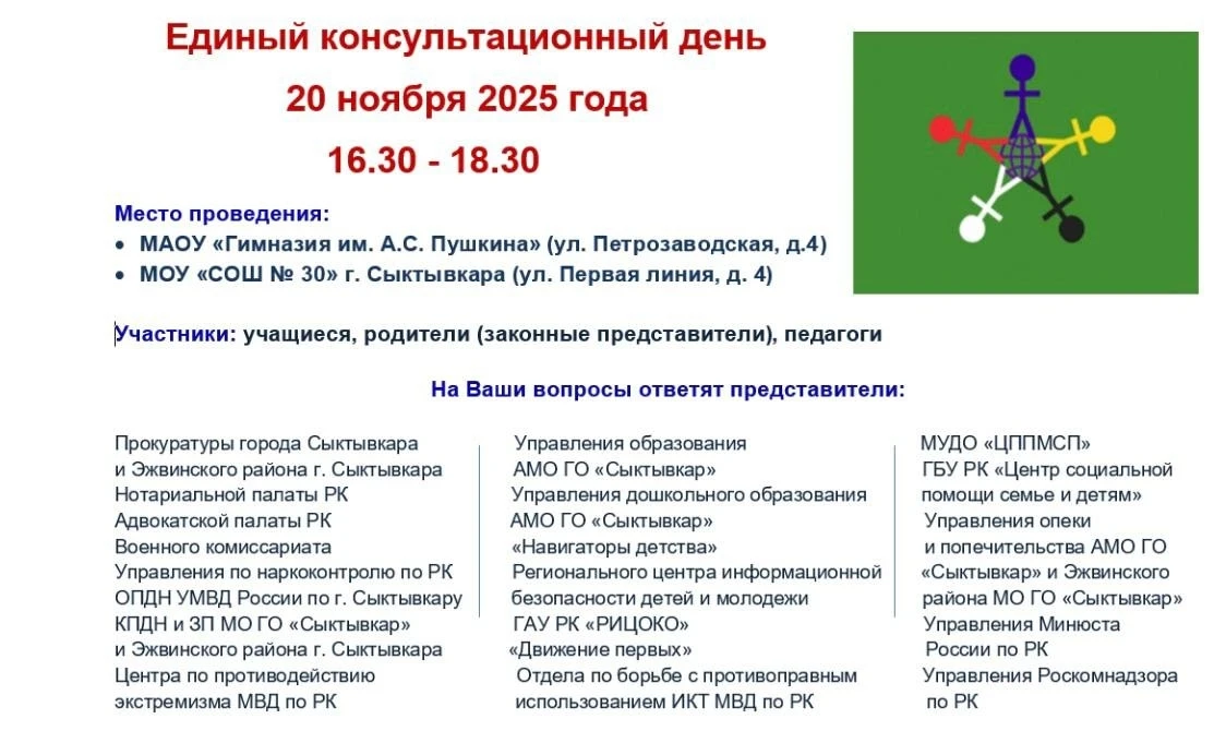 В Сыктывкаре в этот день пройдут общегородские мероприятия по правовому просвещению педагогов, учащихся образовательных организаций и родительской общественности.