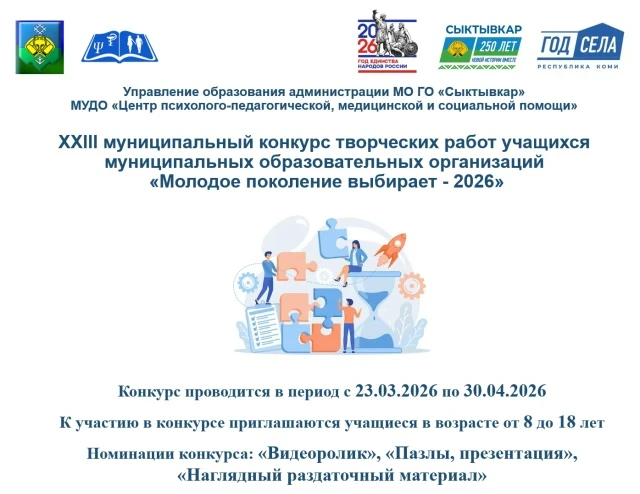 Уважаемые учащиеся образовательных организаций Сыктывкара, а также их родители и педагоги!!! Приглашаем вас принять участие в XXIII муниципальном конкурсе творческих работ учащихся "Молодое поколение выбирает - 2026", посвящённом важнейшим темам нашего времени: здоровому и безопасному образу жизни, профессиональному самоопределению, сохранению исторической памяти и укреплению гражданского единства.
