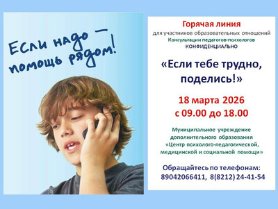 В рамках месячника профилактической работы в муниципальных образовательных организациях «Безопасный МАРТ» МУДО "Центр психолого-педагогической, медицинской и социальной помощи" организована Горячая линия " ЕСЛИ ТЕБЕ ТРУДНО, ПОДЕЛИСЬ!" 18 марта 2026 года (с 09.00 до 18.00) педагоги-психологи ЦППМСП ответят на волнующие вас вопросы, окажут поддержку.